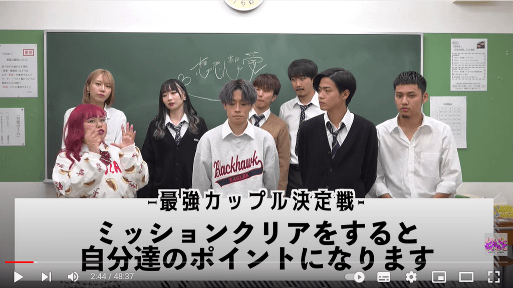 カップルに分かれて、学校内に配置されたミッションをみつけて、そのミッションをクリアしたらポイントが加算されポイントの合計を争います。