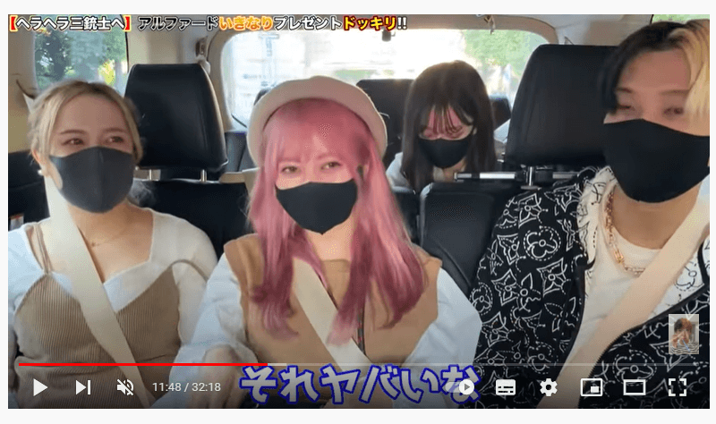 「さすがに100万人記念やからね」「全然ふざけてないよ」と話していると赤い布をまとったアルファードがヘラヘラ三銃士の目に入ります。
