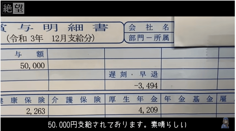 遅刻早退で3000円ほど引かれた事を会社の運営費用に寄付するという言い回しをしています。ここで総支給額は46500円程になり、年金や所得税など控除額のことを国家への罰金と言って「いろんな罰金を払い生きているだけで人は罪人のような思想になります。」と言っています。